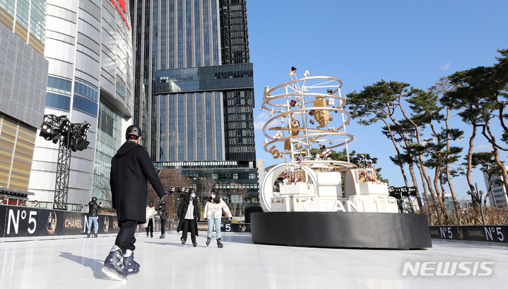 [서울=뉴시스] 이영환 기자 = 1일 오후 서울 송파구 롯데월드타워 야외광장에 설치된 '샤넬 N°5(넘버5) X 아이스링크'에서 시민들이 스케이트를 타고 있다. 내년 1월 16일까지 운영되는 아이스링크는 롯데백화점 잠실점(에비뉴엘 포함)과 잠실 롯데월드몰에서 10만원 이상 구매한 고객에게 당일에 이용 가능한 아이스링크 입장권과 스케이트 대여권 각 2매를 선착순 증정한다. 정오부터 오후 10시까지 시간대별 100명 입장할 수 있다. 2021.12.01. [email protected]