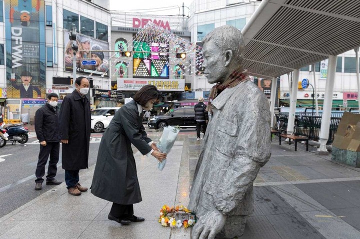 [서울=뉴시스] 김선웅 기자 = 이재명 더불어민주당 대통령 후보 배우자 김혜경 씨가 2일 오후 서울 종로구 전태일기념관을 방문해 '렌즈로 노동을 담다' 기획전을 관람한 후 전태일다리(버들다리)로 이동해 전태일 열사 동상에 헌화하고 있다. (사진=이재명 캠프 제공) 2021.12.03. [email protected] *재판매 및 DB 금지