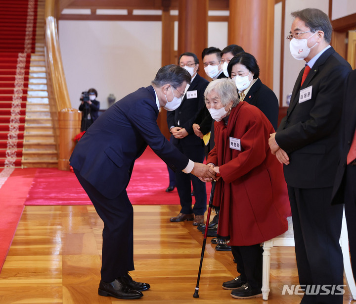 [서울=뉴시스] 김진아 기자 = 문재인 대통령이 3일 오전 청와대에서 열린 '2021 기부·나눔단체 초청행사'에 참석, 김밥 장사로 모은 전 재산을 기부하고 40년간 장애인 봉사활동을 한 초록우산어린이재단 기부자인 박춘자 할머니와 인사를 하고 있다. 2021.12.03. [email protected]