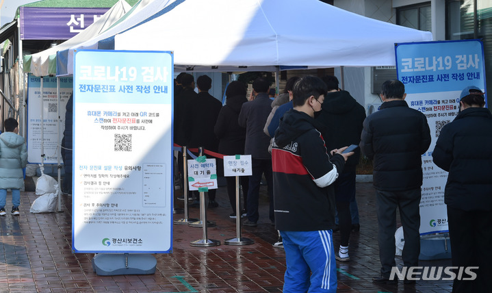[경산=뉴시스] 이무열 기자 = 3일 오전 경북 경산보건소 코로나19 선별진료소에서 시민들이 PCR 검사를 받기 위해 순서를 기다리고 있다. 2021.12.03. [email protected]