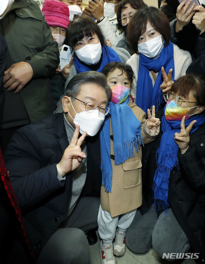 [군산=뉴시스] 최동준 기자 = 이재명 더불어민주당 대선 후보가 4일 전북 군산시 공설시장을 방문해 지지자들과 기념촬영을 하고 있다. 2021.12.04. [email protected]