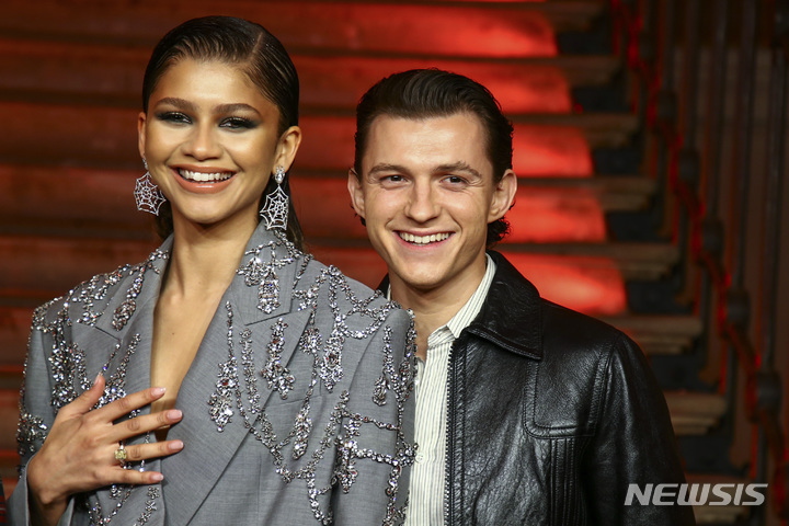[런던=AP/뉴시스] 배우 톰 홀랜드(오른쪽)와 젠데이아 콜먼이 5일(현지시간) 영국 런던에서 열린 영화 '스파이더맨: 노 웨이 홈' 포토콜 행사에 참석해 포즈를 취하고 있다. 2021.12.06.