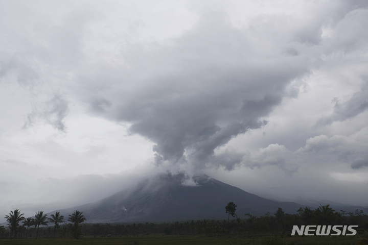 [루마장=AP/뉴시스] 6일(현지시간) 인도네시아 동자바 주 루마장 지구의 스메루 화산이 폭발해 화산재 등을 내뿜고 있다. 스메루 화산이 앞선 4일 폭발하면서 지금까지 14명이 숨지고 50여 명이 다친 것으로 나타났다. 이번 폭발로 주민 1300여 명이 대피하고 마을에 엄청난 양의 화산재가 쌓이는 등 피해가 잇따르고 있다. 2021.12.06.