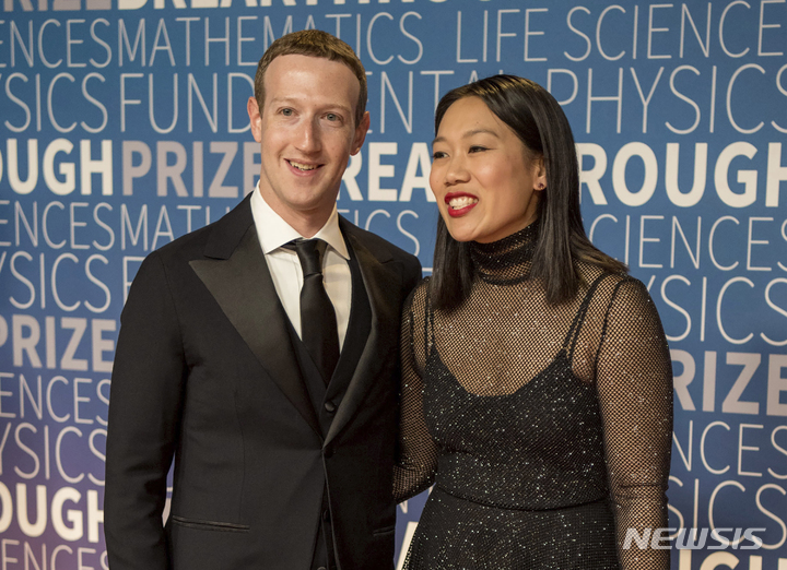 [샌프란시스코=AP/뉴시스] 마크 저커버그 메타 CEO와 부인 프리실라 챈의 자선재단 '챈-저커버그 이니셔티브'가 인류의 건강 증진을 위해 10년~15년에 걸쳐 최대 34억 달러를 투자한다고 이 단체 대변인이 7일(현지시간) 발표했다. 사진은 2018년 11월 4일 당시 페이스북 CEO 저커버그가 부인 챈과 함께 캘리포니아주 마운틴뷰의 나사 에임스 연구센터에서 열린 시상식에 도착한 모습. 2021.12.08.