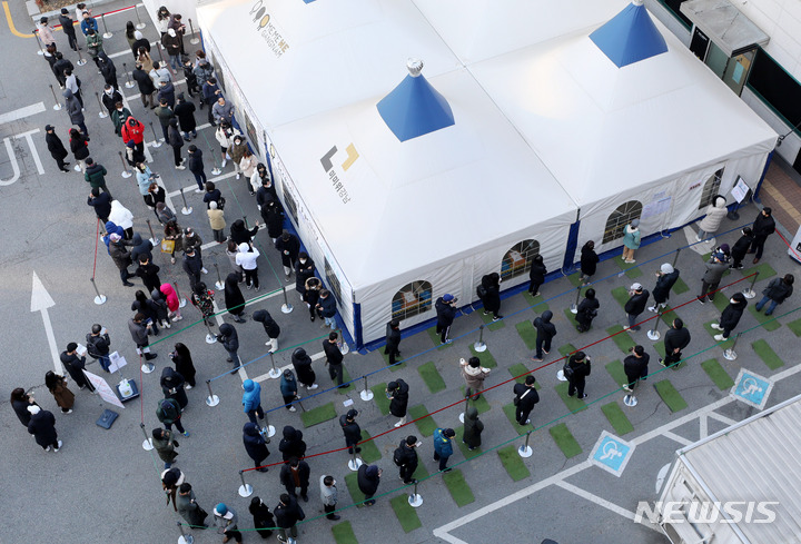 [서울=뉴시스] 추상철 기자 = 코로나19 확진자수가 7000명대를 넘어선 8일 오전 서울 강남구보건소 선별진료소에서 많은 시민들이 코로나19 검사를 받기 위해 길게 줄지어 서 있다. 2021.12.08. [email protected]