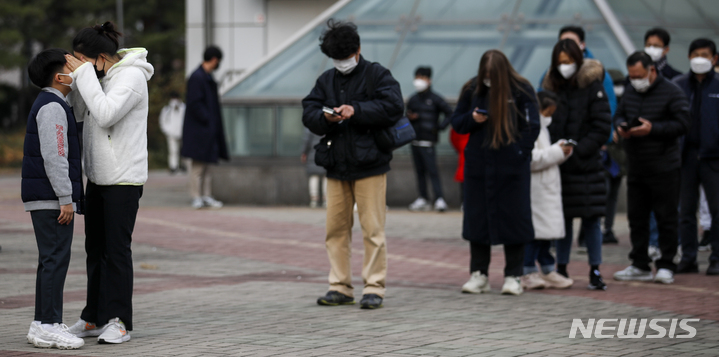 [서울=뉴시스] 정병혁 기자 = 0시 기준 국내 코로나19 신규 확진자가 7102명으로 이틀째 7천명대를 이어가고 있는 9일 오전 서울 마포구 서강대역에 설치된 임시선별검사소를 찾은 시민들이 검사를 받기 위해 줄 서 있다. 2021.12.09. [email protected]