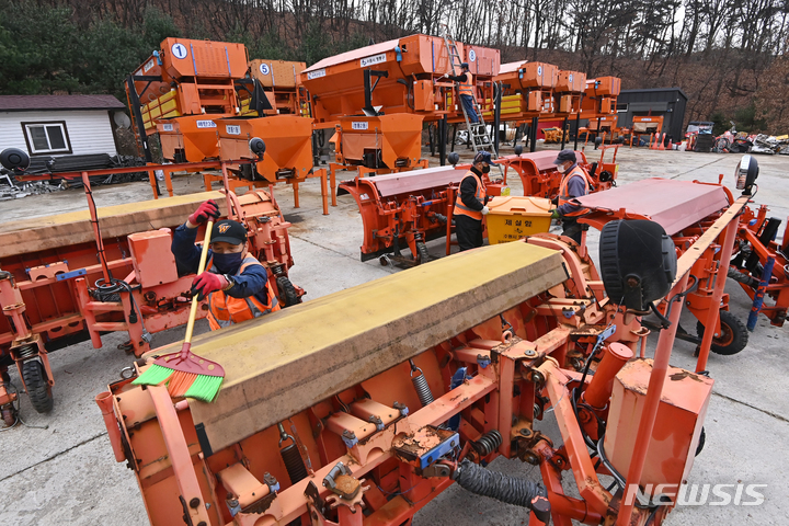 [수원=뉴시스] 김종택기자 = 9일 오전 경기도 수원시 영통구 하동 제설전진기지에서 관계자들이 살포기 등 제설 장비를 점검하고 있다. 수원시는 오는 17일까지 대설·한파 등 겨울철 자연재난 대비 인명피해 우려 지역 일제 점검을 진행한다. 2021.12.09.