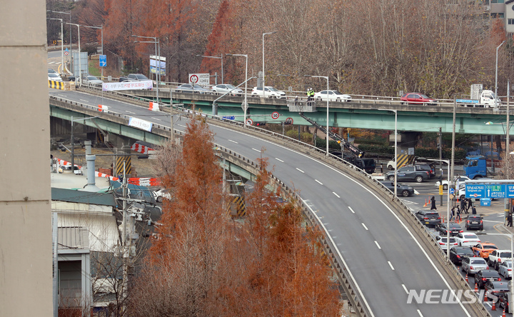 [서울=뉴시스] 고승민 기자 = 서울시가 건설된지 30년이 지난 선유고가차도를 내년 12월까지 단계적으로 철거한다고 밝힌 가운데 철거 시작일인 9일 선유고가차도가 통제되고 있다. 이날부터 2022년 5월까지 여의도 방면(목동→여의도) 2차로가 먼저 철거된다. 이후 선유도방면(목동→선유도) 2차로 차량통제와 철거에 돌입해 2022년 9월까지 완료된다. 마지막으로 시점부인 목동방면 2차로를 2022년 12월까지 철거할 계획이다. 2021.12.09. [email protected]