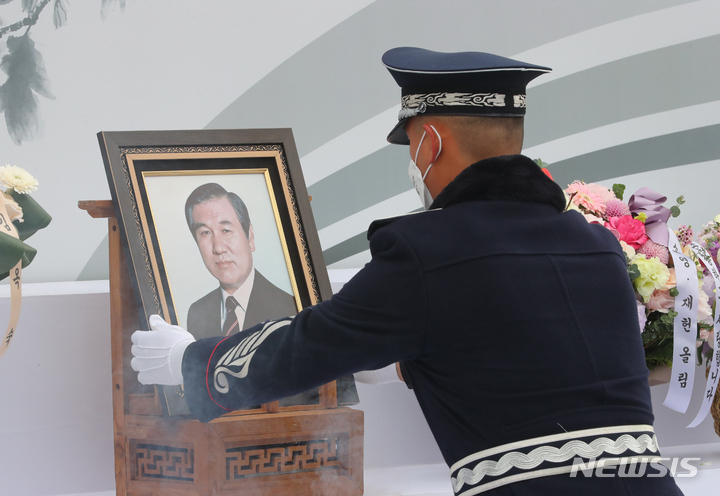 [파주=뉴시스] 배훈식 기자 = 고 노태우 전 대통령 국가장 안장식이 열린 9일 오후 경기 파주시 동화경모공원에서 의장대가 영정을 올리고 있다. 2021.12.09. [email protected]