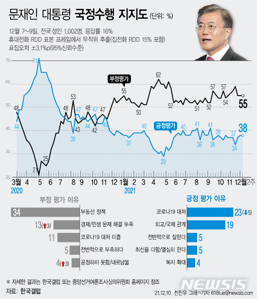 [서울=뉴시스] 한국갤럽은 12월 2주차 문재인 대통령의 직무수행 평가를 조사한 결과 38%가 긍정 평가를 기록했다고 3일 밝혔다. 부정 평가는 55%이다. (그래픽=전진우 기자)