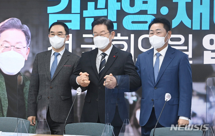 [서울=뉴시스] 국회사진기자단 = 이재명(가운데) 더불어민주당 대선후보가 10일 오전 서울 영등포구 더불어민주당사에서 열린 바른미래당 출신 김관영(오른쪽), 채이배 전 의원의 입당식에서 두 전의원의 손을 잡고 있다. 2021.12.10. [email protected]