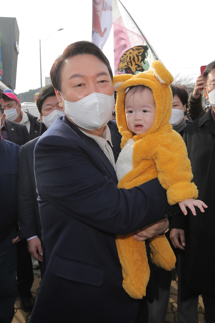 [속초=뉴시스] 전신 기자 = 윤석열 국민의힘 대선 후보가 11일 강원도 속초 대포어촌계 어업인복지회관에서 열린 강원도 살리는 현장 간담회에 참석하며 한 아이를 안고 기념촬영 하고 있다. (공동취재사진)2021.12.11. [email protected]