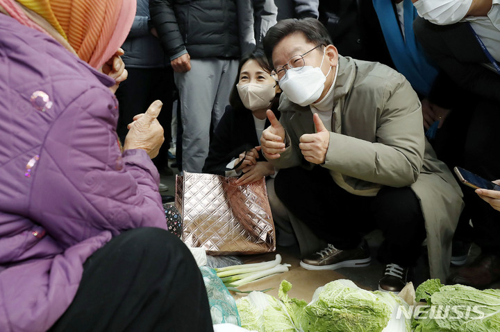 [예천=뉴시스] 최동준 기자 = 이재명 더불어민주당 대선 후보, 부인 김혜경 씨가 12일 경북 예천읍 상설시장을 방문해 상인 어르신과 인사하고 있다. 2021.12.12. [email protected]