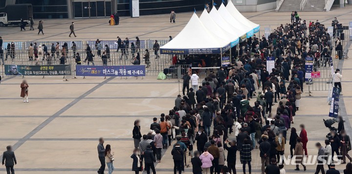 [부산=뉴시스] 하경민 기자 = 연일 코로나19 확진자가 폭증하고 있는 상황 속에서 12일 오후 부산 해운대구 벡스코 제1전시장에서 열린 '나훈아 어게인(AGAIN) 테스형' 콘서트에 입장하기 위해 관객들이 길게 줄을 선 채 방역패스 절차를 거치고 있다. 나훈아 부산 콘서트는 이 날까지 사흘 동안 총 6차례에 걸쳐 열리며, 1회당 4000여 명이 입장한다. 2021.12.12. [email protected]