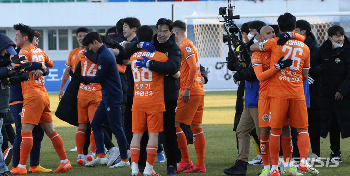 [강릉=뉴시스] 김경목 기자 = 최용수 강원FC 감독과 선수들이 12일 오후 강원 강릉시 강릉종합운동장에서 열린 하나원큐 K리그1(1부리그) 2021 승강 플레이오프 2차전 대전하나시티즌과의 경기에서 4-1 승리로 1부리그 잔류가 확정되자 기뻐하고 있다. 2021.12.12. [email protected]