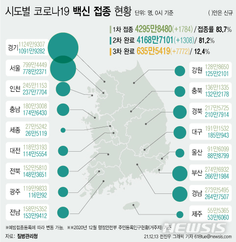 [그래픽] 시도별 코로나19 백신 접종…1차 경기 1124.9만, 서울 799.4만명