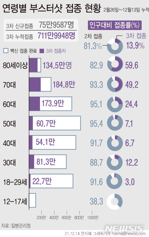 [서울=뉴시스] 14일 코로나19 예방접종대응추진단에 따르면, 이날 0시 기준 코로나19 3차 접종 참여자는 누적 711만9948명으로 전날 하루에만 75만9587명이 참여했다. 전체 인구(5134만9116명·2020년 12월 주민등록 거주자 인구) 대비 13.9%가 참여했다. (그래픽=안지혜 기자)
