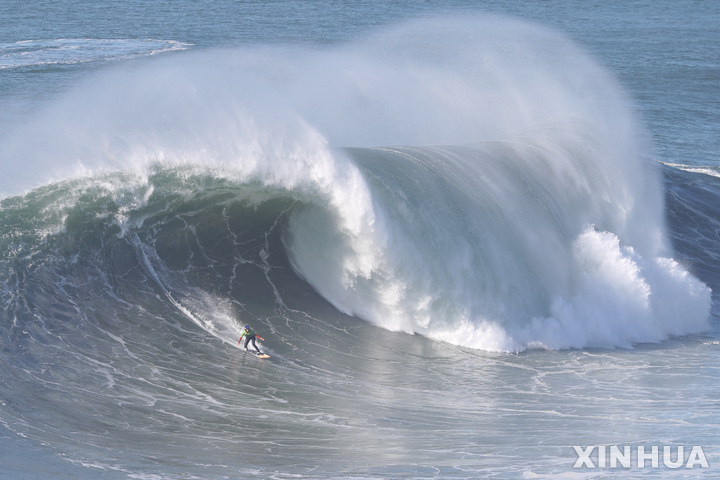 [나자르=신화/뉴시스] 13일(현지시간) 포르투갈 나자르의 프라이아 두 노르트 해변에서 파도타기 대회 '투도르 나자르 토우 서핑 챌린지'(Tudor Nazare Tow Surfing Challenge)가 열려 한 참가자가 파도를 타고 있다. 2021.12.14.