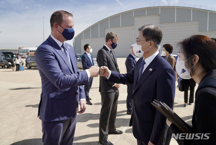 [캔버라=뉴시스] 전진환 기자 = 호주를 국빈 방문 중인 문재인 대통령이 14일 호주 캔버라 페어베언 공군기지에서 시드니로 이동하기 위해 공군 1호기에 탑승하기 앞서 폴 싱어 총독 비서실장과 인사하고 있다. 2021.12.14. [email protected]