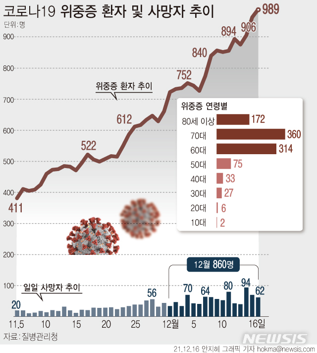 [서울=뉴시스] 16일 0시 기준 재원 중인 코로나19 위중증 환자 수는 1000명에 육박한 989명이다. 사망자는 62명이 더 늘어 누적 4518명이다. 12월에만 860명이 코로나19로 숨졌다.  (그래픽=안지혜 기자)
