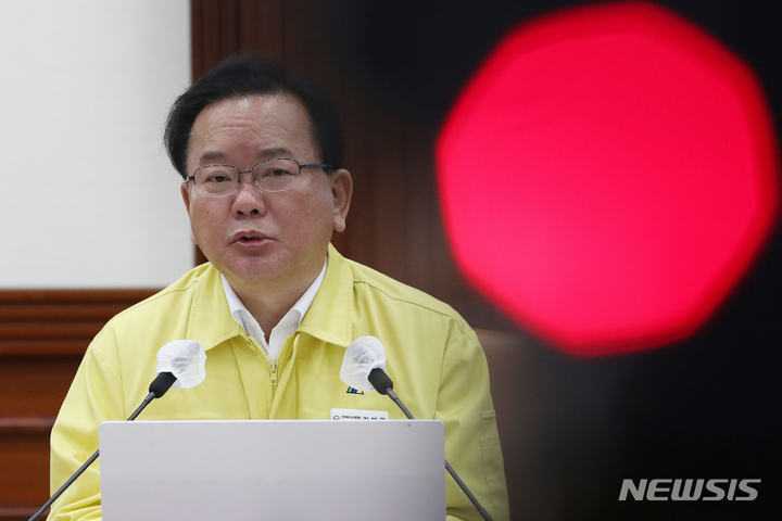 [서울=뉴시스] 김명원 기자 = 김부겸 국무총리가 16일 오전 서울 종로구 정부서울청사에서 열린 코로나19 중앙재난안전대책본부(중대본) 회의에 참석해 발언하고 있다. 김 총리는 "사적모임 허용인원을 4인까지로 축소하고 전국에 걸쳐 동일하게 적용한다"면서 "식당·카페의 경우, 접종완료자로만 4인까지 이용이 가능하며, 미접종자는 혼자서 이용하거나 포장·배달만 허용된다"고 밝혔다. (공동취재사진) 2021.12.16. [email protected]