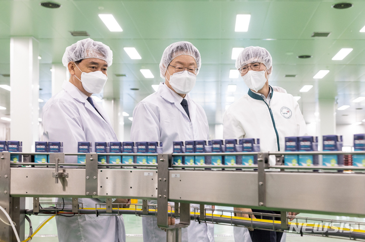 원주 식음료 공장 방문해 시설 둘러보는 이재명 후보