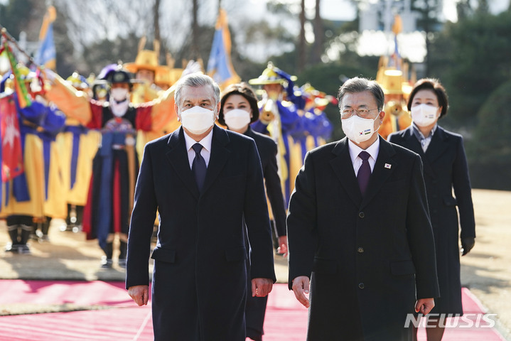 [서울=뉴시스] 김진아 기자 = 국빈 방한 중인 샵카트 미르지요예프 우즈베키스탄 대통령이 17일 청와대 대정원에서 열린 공식환영식에서 문재인 대통령과 의장대를 사열하고 있다. 2021.12.17. [email protected]