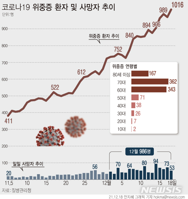 [그래픽] 코로나 위중증 1016명 '첫 1000명대'