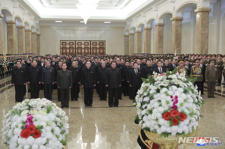[평양=AP/뉴시스] 북한 조선중앙통신이 제공한 사진에 김정은(가운데) 북한 국무위원장이 17일 김정일 전 국방위원장 사망 10주기를 맞아 평양의 금수산태양궁전을 참배하고 있다. 2021.12.18.
