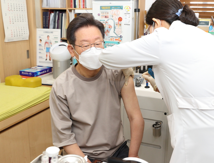[서울=뉴시스] 전신 기자 = 이재명 더불어민주당 대선 후보가 18일 서울 한 병원에서 코로나19 백신 추가 접종(부스터샷)을 하고 있다. (사진=더불어민주당 제공) 2021.12.18. [email protected] *재판매 및 DB 금지