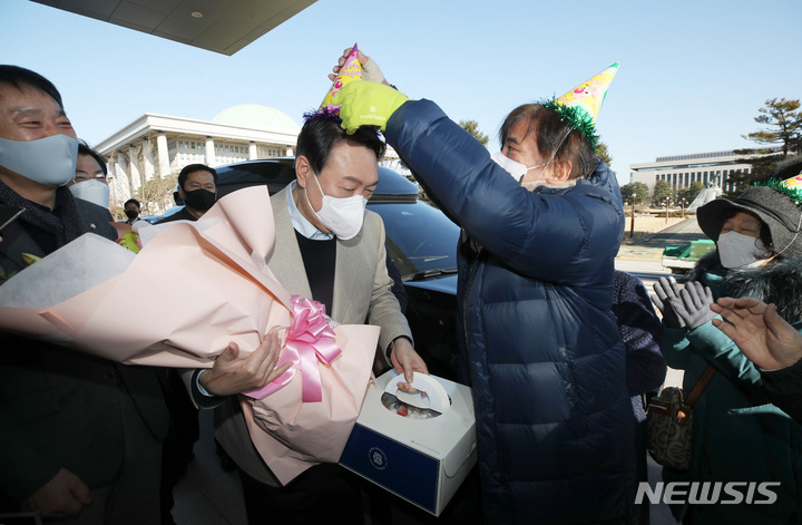 [서울=뉴시스] 전신 기자 = 윤석열 국민의힘 대선 후보가 18일 서울 여의도 국회 의원회관 앞에서 지지자들로부터 생일을 축하 받고 있다. 2021.12.18. [email protected]