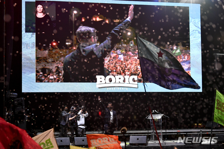[산티아고=AP/뉴시스] 칠레 '존엄성을 지지하다' 당의 가브리엘 보리치(35) 대선 후보가 19일(현지시간) 대선 결선 투표에서 승리한 후 산티아고에서 지지자들에게 인사하고 있다. 오는 3월 취임하는 보리치는 칠레의 최연소 대통령이 된다. 2021.12.20.
