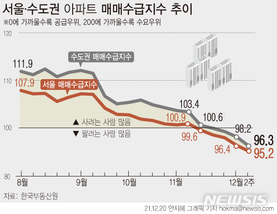 [서울=뉴시스] 20일 한국부동산원에 따르면 지난 주 서울 아파트 매매수급지수(13일 기준)는 95.2로 전주에 비해 1.2포인트 하락했다. 이는 작년 5월11일 94.9를 기록한 이후 1년7개월 만에 가장 낮은 수치다. (그래픽=안지혜 기자)