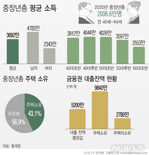 [서울=뉴시스] 통계청이 21일 내놓은 '2020년 중·장년층 행정통계 결과'를 보면  평균 소득은 3692만원으로 전년(3555만원)대비 3.8% 증가했다.