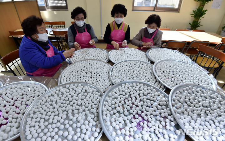 [영천=뉴시스] 이무열 기자 =  절기상 동지(冬至)를 하루 앞둔 21일 오후 경북 영천시 청동면 은해사에서 신도들이 동지 팥죽에 들어갈 새알을 정성스레 빚고 있다. 2021.12.21. [email protected]
