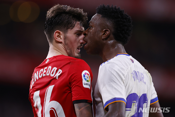 [빌바오=AP/뉴시스] 아틀레틱 빌바오의 우나이 벤세도르(왼쪽)와 레알 마드리드의 비니시우스 주니오르가 22일(현지시간) 스페인 빌바오의 산 마메스 경기장에서 열린 2021-22시즌 스페인 라리가 9라운드 경기 중 신경전을 벌이고 있다. 이날 레알 마드리드가 2-1 승리를 거뒀다. 2021.12.23.