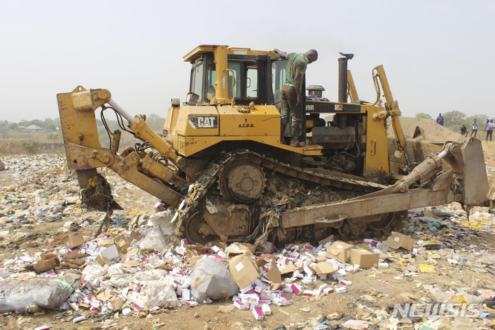 [아부자=AP/뉴시스] 22일(현지시간) 나이지리아 아부자에서 공무원들이 유통기한이 지난 코로나19 백신을 폐기하고 있다. 나이지리아 당국은 기한 만료 전에 사용하지 못한 아스트라제네카 백신 100만 개 이상을 폐기했다고 밝혔다. 2021.12.23.