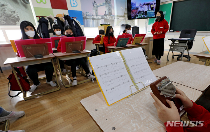 [대구=뉴시스] 이무열 기자 = 크리스마스 이브인 24일 오전 대구 달성군 가창초등학교 6학년 교실에서 진행된 방학식에서 학생들과 선생님이 크리스마스 복장을 맞춰 입고 칼림바 연주를 하고 있다. 2021.12.24. [email protected]