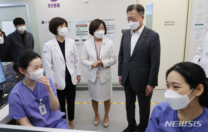 [서울=뉴시스] 김진아 기자 = 문재인 대통령이 24일 서울 강서구 마곡동 이화여자대학교 의과대학 부속 서울병원을 방문, 의료진과 대화하고 있다. 2021.12.24. [email protected]