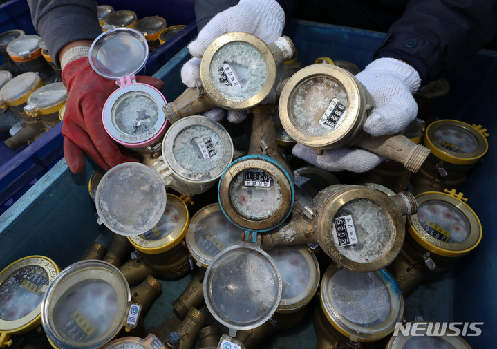 [서울=뉴시스] 조수정 기자 = 전국 대부분 지역에 한파 특보가 발효된 가운데 서울 영하 15.5도의 기온을 기록한 26일 오전 서울 종로구 중부수도사업소 효자가압장에서 강준혁 주임과 김재영 주임이 동파된 수도계량기를 수거해 확인하고 있다. 2021.12.26. [email protected]