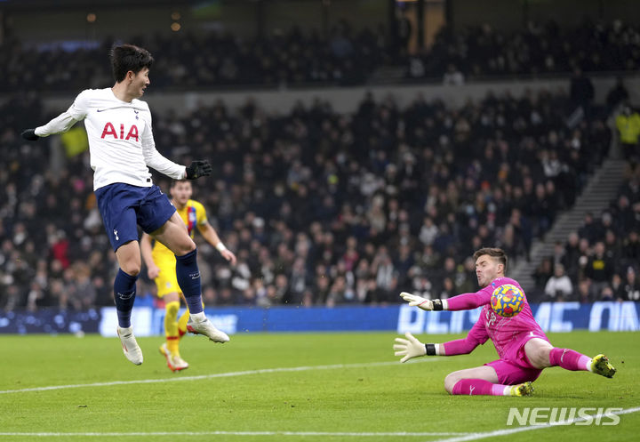 [런던=AP/뉴시스] 토트넘 홋스퍼의 손흥민(왼쪽)이 26일(현지시간) 영국 런던의 토트넘 홋스퍼 경기장에서 열린 2021~22 잉글랜드 프리미어리그(EPL) 19라운드 크리스털 팰리스와의 경기 후반 29분 팀의 세 번째 골을 넣고 있다. 손흥민은 리그 8호 골을 기록하며 토트넘의 3-0 완승을 이끌었다. 2021.12.27.