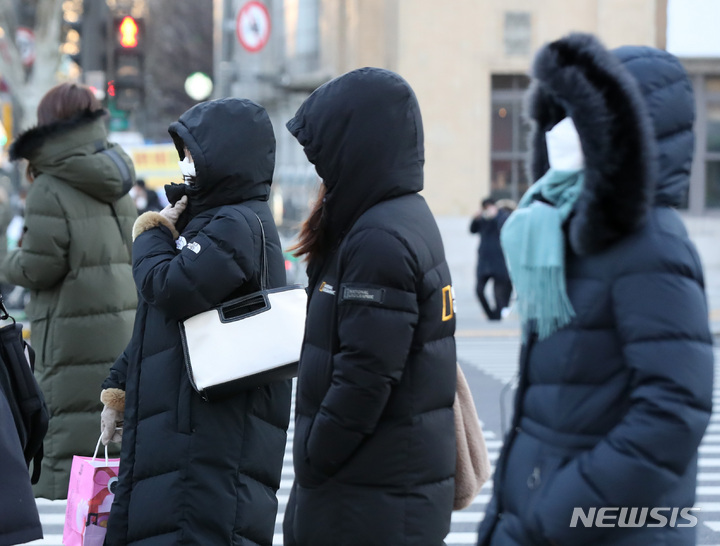[서울=뉴시스] 조수정 기자 = 전국 대부분 지역에 한파특보가 발효된 27일 오전 서울 세종로 사거리에서 시민들이 두꺼운 외투를 입고 출근길 발걸음을 재촉하고 있다. 2021.12.27. [email protected]