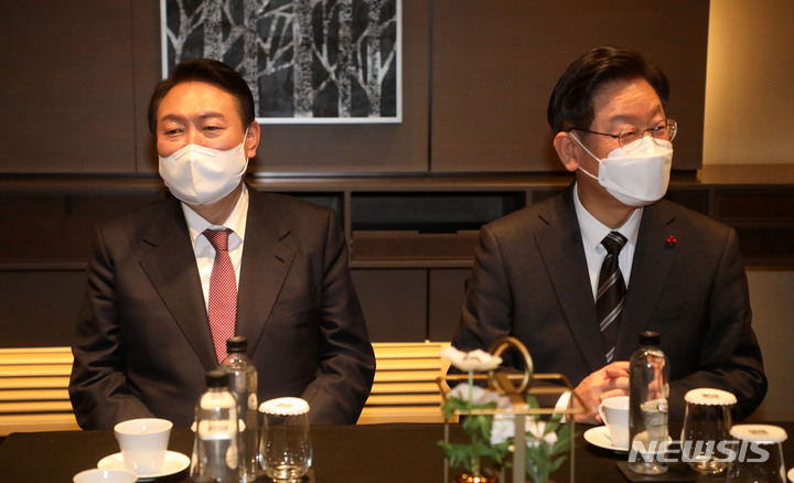 [서울=뉴시스] 김선웅 기자 = 이재명 더불어민주당 대선 후보와 윤석열 국민의힘 대선 후보가 28일 서울 여의도 페어몬트 앰배서더 서울 호텔에서 열린 국가균형발전을 위한 지방소멸대응특별법안 국회발의 간담회 시작에 앞서 열린 사전환담에 참석해 대화를 나누고 있다. 2021.12.28. [email protected]