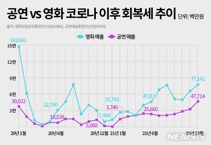 영화는 지난 1월 매출액 157억원을 찍은 후 여름 극장가의 힘을 받아 8월에 약 763억원까지 올라섰다. 이후 9월에 522억원으로 감소 폭을 보였지만, 최근 할리우드 대작들의 잇단 개봉으로 12월에 약 771억원으로 다시 증가했다. 다만 코로나19 이전의 매출인 1000억원대로는 아직 올라서지 못했다. 2021.12.30. (자료=예술경영지원센터 공연예술통합전산망(KOPIS)·영화진흥위원회 영화관입장권 통합전산망(KOBIS) 제공) [email protected]