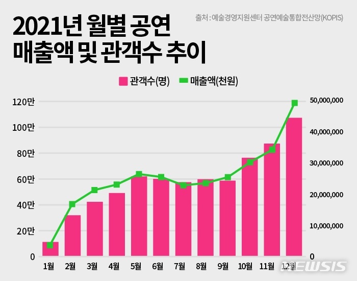 관객 수도 1월에 11만명으로 가장 낮은 수치를 보였지만, 2월에 31만명, 3월에 42만명, 4월에 49만명, 5월에 62만명까지 올랐다. 공연이 집중되는 하반기에는 10월에 76만명, 11월에 87만명으로 집계됐다. 2021.12.31. (자료=예술경영지원센터 공연예술통합전산망(KOPIS) 제공) [email protected]