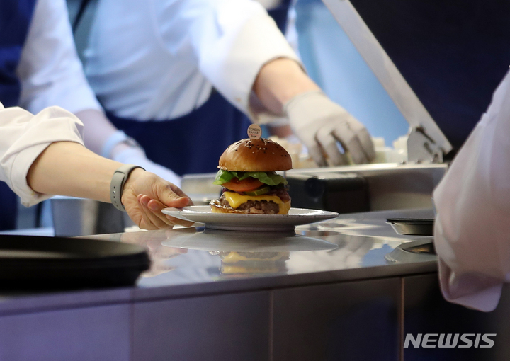 [서울=뉴시스] 조성우 기자 = 30일 오전 서울 송파구 잠실 롯데월드몰에 프리 오픈한 스타 셰프 고든 램지의 하이엔드 버거 레스토랑인 '고든 램지 버거'에서 직원이 버거를 전달하고 있다. 2021.12.30. [email protected]