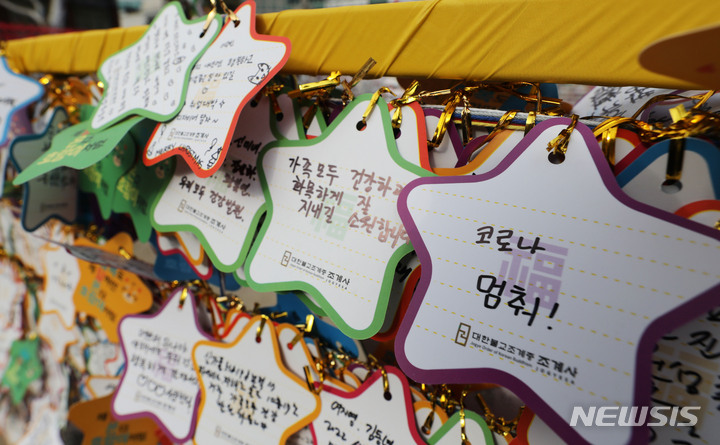 [서울=뉴시스] 권창회 기자 = 2022년 임인년(壬寅年)을 앞둔 30일 오후 서울 종로구 조계사에 설치된 2022 소원의 탑에 시민들의 새해 소망을 적은 메모지가 걸려 있다. 2021.12.30. [email protected]