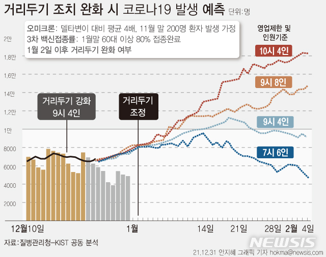 [서울=뉴시스] 31일 질병청과 한국과학기술연구원(KIST)이 공동 분석한 '오미크론 변이 영향을 반영한 코로나19 발생 예측 모형'에 따르면 내년 1월2일 이후 영업제한을 오후 9시에서 오후 10시로 1시간 완화하면 확진자 수가 1월말 1만8000명대로 증가하는 것으로 나타났다. (그래픽=안지혜 기자)