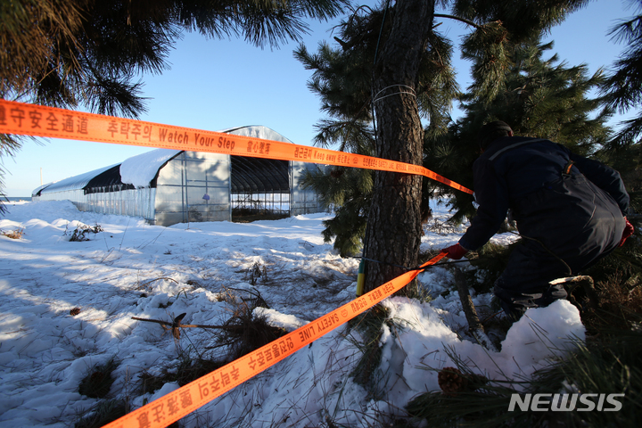 [속초=뉴시스] 김경목 기자 = 2022년 임인년 새해를 하루 앞둔 31일 오후 속초시 관계자들이 강원 속초시 외옹치해변에서 속초해변까지 해맞이객들의 백사장 출입을 통제하는 출입통제선을 설치하고 있다. 2021.12.31. [email protected]