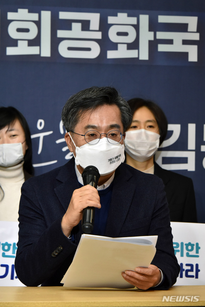 [서울=뉴시스] 국회사진기자단 = 미래당이 김동연 새로운 물결 대선후보를 공개적으로 지지하고 선거연합을 결성할 것을 공식 선언한 가운데 김동연 새로운 물결 대선 후보가 3일 서울 영등포구 캠프에서 오태양 미래당 대표에게 환영 인사를 하고 있다. 2022.01.03. [email protected]